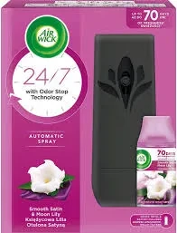 The Air Wick Freshener Auto Machine with Smooth Satin & Moon Lily refill is an automatic air freshener that releases bursts of fragrance at regular intervals.