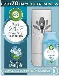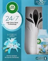 The Air Wick Freshener Auto Machine with Refill Spring Delight is an automatic air freshener that releases bursts of fragrance at regular intervals to keep your home smelling fresh. The Spring Delight refill offers a light, floral scent inspired by spring blossoms. The device is adjustable, allowing you to control the frequency of sprays, and it features a sleek, modern design that blends well with home decor. The refills are easy to replace, ensuring continuous fragrance coverage.