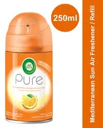 The Air Wick Freshener Refill - Mediterranean Sun (250ml) is a scented oil refill designed for Air Wick plug-in air fresheners. It features a warm, citrusy fragrance inspired by the Mediterranean, with notes of sun-kissed lemons, bergamot, and aromatic herbs. The 250ml bottle provides long-lasting freshness, automatically releasing bursts of fragrance to keep your home smelling inviting.