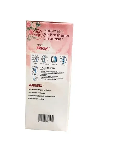 The Anee Automachine Freshener is an automatic air freshener dispenser designed for cars. It releases fragrance at set intervals to keep the vehicle smelling fresh. It typically features: