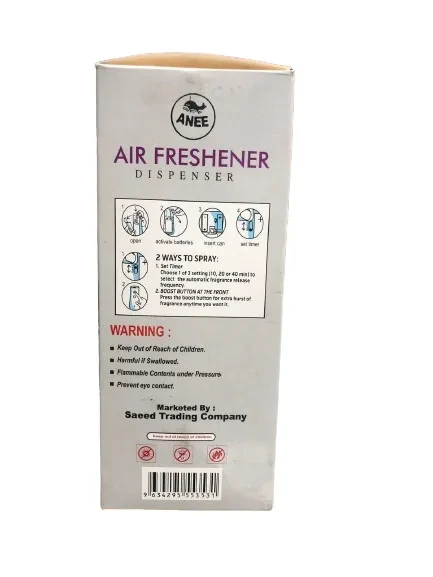 The Anee Automachine Freshener is an automatic air freshener dispenser designed for cars, offices, or small spaces. It releases fragrance at set intervals, ensuring a pleasant and consistent aroma. It typically uses refillable cartridges, features adjustable spray settings, and may operate on batteries or USB power. Compact and easy to install, it helps eliminate odors while providing a customizable scent experience.