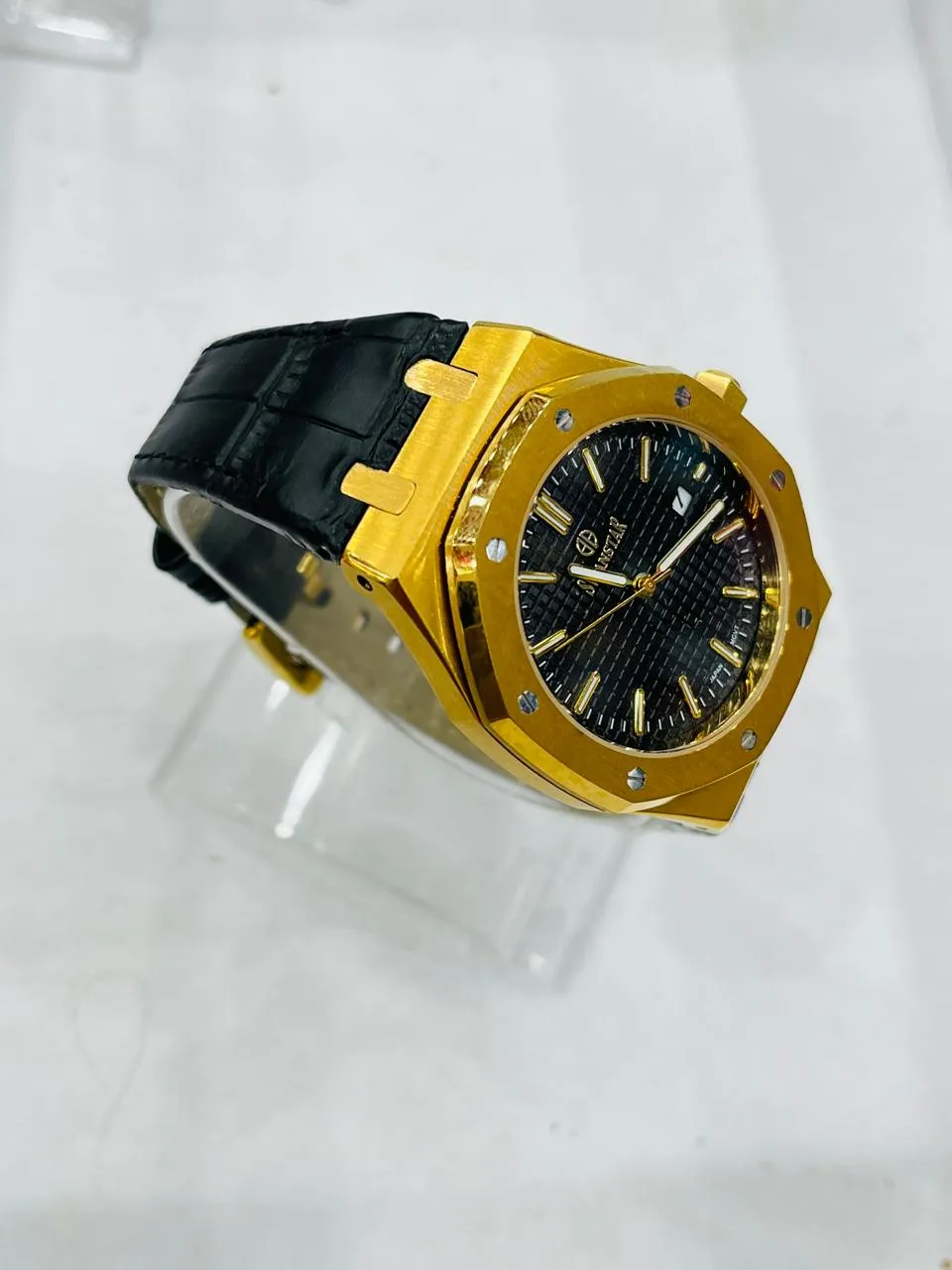 The Swanstar S1885G is a stylish men's watch featuring a sleek black dial paired with a classic leather strap. It offers a sophisticated and minimalist design, suitable for both formal and casual occasions. The watch likely includes essential functions like timekeeping and date display, housed in a durable casing. Its black leather band adds elegance, while the black dial ensures easy readability. A perfect blend of affordability and style.