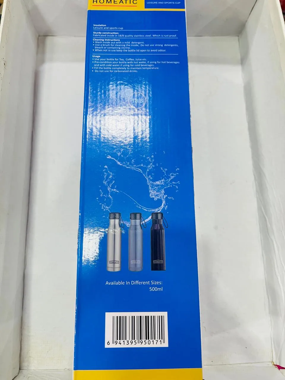 The Homematic Steel Water Bottle HKA-017-500ML is a durable, BPA-free stainless steel bottle designed for everyday use. With a 500ml capacity, it features a leak-proof lid, double-walled insulation to keep drinks hot or cold for hours, and a sleek, portable design. Ideal for home, office, or travel, it’s eco-friendly and easy to clean.