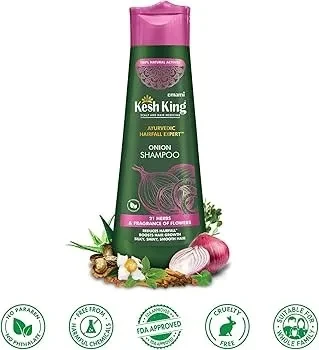 Kesh King Shampoo Onion (340ml) is an Ayurvedic hair care product designed to promote hair growth and reduce hair fall. Enriched with natural ingredients like onion extract, bhringraj, amla, and other herbal extracts, it helps strengthen hair roots, prevent breakage, and improve scalp health. Suitable for all hair types, this shampoo also adds shine and reduces dandruff while maintaining natural moisture balance. Free from harmful chemicals, it is a popular choice for those seeking healthier, thicker hair.