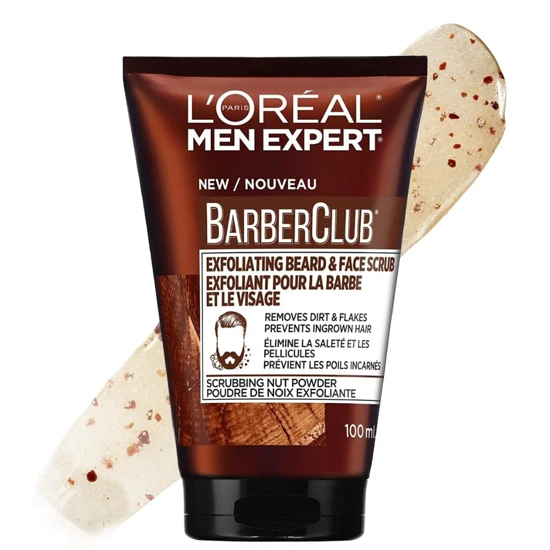 The L'Oréal Paris Men Expert Barber Club Face Scrub (100ml) is a facial scrub designed for men's skin. It features a gritty texture to exfoliate dead skin cells, unclog pores, and remove impurities. Enriched with menthol and eucalyptus, it provides a refreshing, cooling sensation while helping to prevent ingrown hairs and smooth the skin. Ideal for pre- or post-shave use, it promotes a cleaner, smoother complexion. The product is part of the Barber Club line, inspired by professional barber care for men.