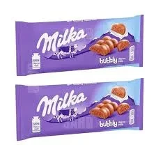 Milka Chocolate Bubbly (93g) is a creamy milk chocolate bar with a light, airy bubbly texture. It features Milka's signature Alpine milk chocolate, filled with tiny bubbles for a melt-in-your-mouth experience. The smooth, rich flavor combines sweetness with a delicate crunch, making it a delightful treat for chocolate lovers. Packaged in Milka's iconic purple wrapper, it’s a popular choice for a sweet snack.