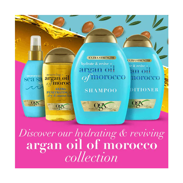 The OGX Conditioner Argan Oil of Morocco (385ml) is a nourishing hair conditioner infused with argan oil, known for its moisturizing and shine-enhancing properties. It helps repair dry, damaged hair, reduces frizz, and leaves hair soft, smooth, and silky. The formula is sulfate-free and enriched with vitamin E to protect and strengthen hair. Suitable for all hair types, it has a warm, exotic fragrance and comes in a convenient 385ml bottle.