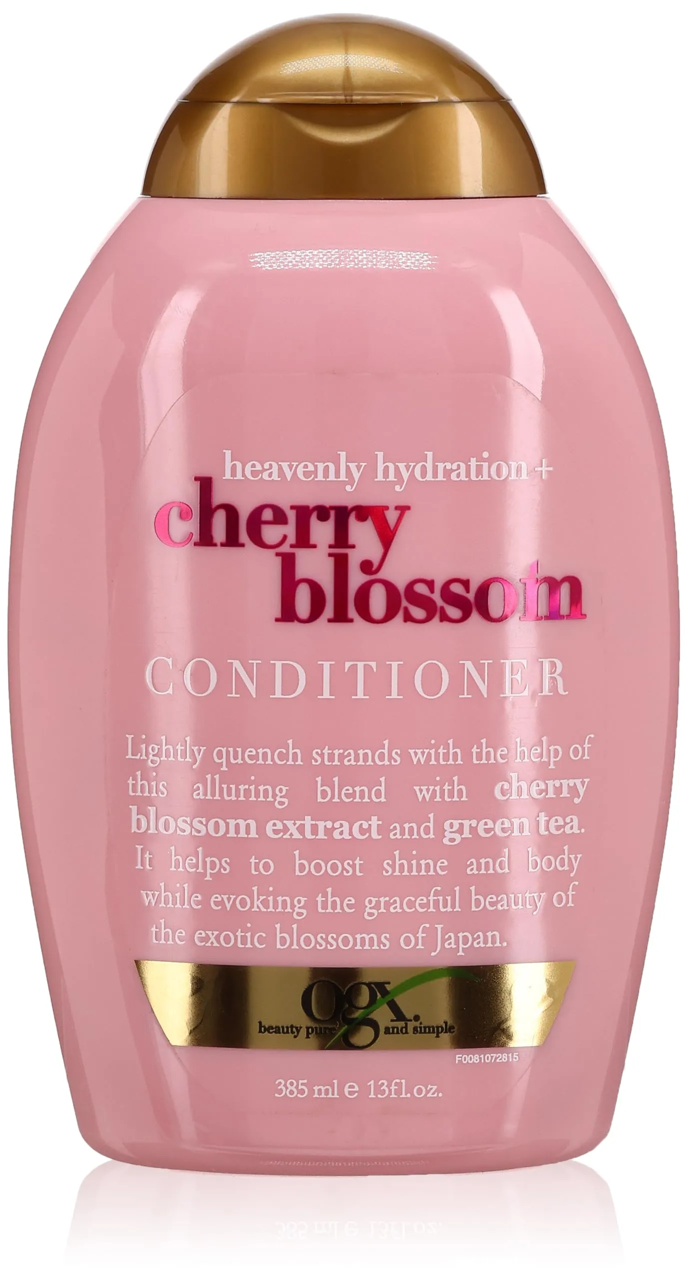 The OGX Conditioner Cherry Blossom 385ml is a hydrating and lightweight conditioner designed to nourish and soften hair. Infused with cherry blossom extract, silk proteins, and sweet almond oil, it helps to add shine, improve manageability, and protect hair from damage. The formula is sulfate-free, paraben-free, and gently scented with a delicate floral fragrance. Ideal for all hair types, it leaves hair feeling smooth, refreshed, and lightly perfumed. The 385ml bottle comes in OGX's signature stylish packaging.