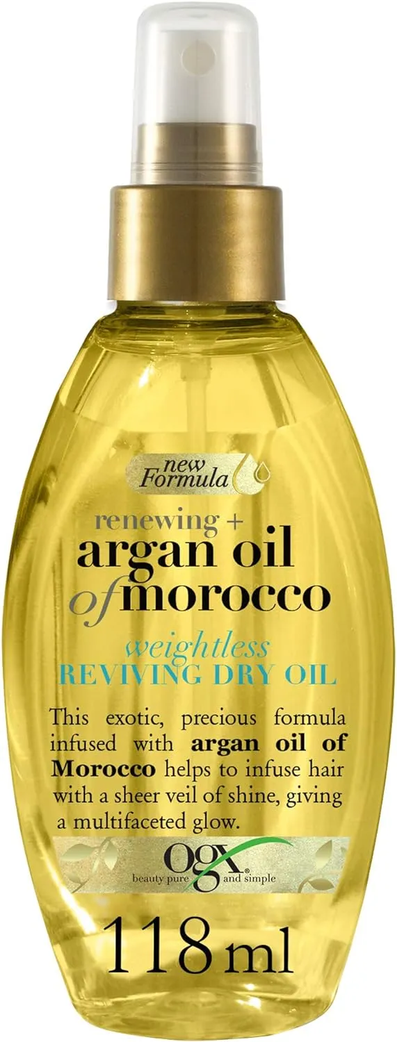 OGX Renewing + Argan Oil of Morocco (118ml) is a lightweight, nutrient-rich hair oil that helps hydrate, soften, and add shine to dry or damaged hair. Enriched with argan oil, it helps reduce frizz, improve manageability, and protect hair from heat styling. The formula is free from sulfates and parabens, making it suitable for most hair types. Its non-greasy texture leaves hair smooth and lustrous with a subtle, exotic fragrance.