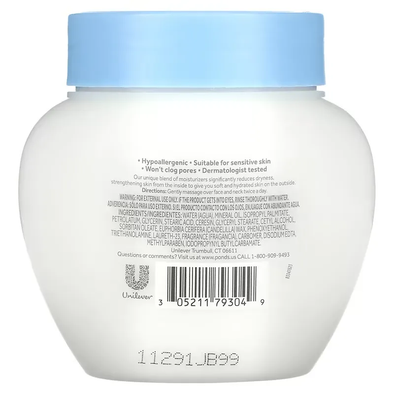 Pond's Cream Blue (Dry Skin) 286g is a moisturizing cold cream designed for dry skin. It provides deep hydration, helps nourish and soften the skin, and creates a protective barrier to prevent moisture loss. The rich, smooth formula is easily absorbed, leaving the skin smooth and supple. Ideal for daily use, it also helps maintain a healthy glow. The 286g jar offers long-lasting use.