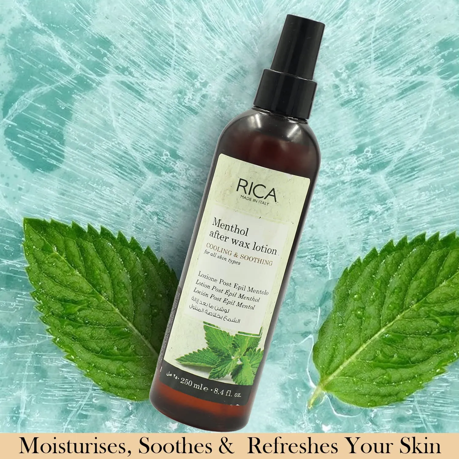RICA After Wax Lotion Menthol 250ML is a soothing post-waxing lotion designed to calm and moisturize the skin. Infused with menthol, it provides a cooling sensation to reduce redness, irritation, and inflammation after hair removal. The formula helps prevent ingrown hairs, keeps the skin hydrated, and leaves a refreshing feel. Ideal for all skin types, it promotes smooth, soft skin post-waxing.