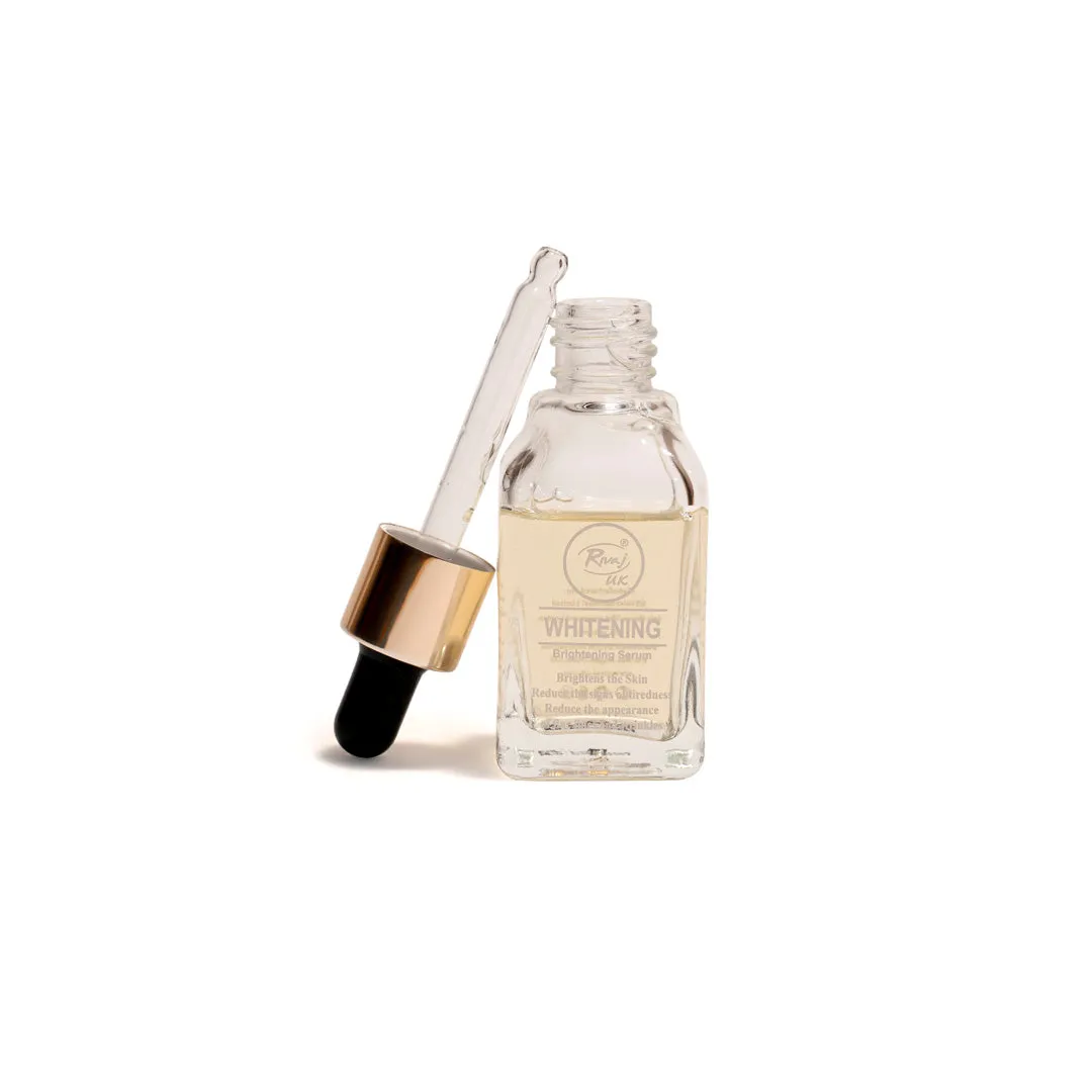 Rivaj Face Serum Whitening 30ML is a skin-brightening serum designed to reduce dark spots, even out skin tone, and promote a radiant complexion. Enriched with ingredients like vitamin C, niacinamide, or kojic acid (varies by formulation), it helps lighten hyperpigmentation, improve skin texture, and protect against environmental damage. Suitable for most skin types, it’s lightweight, fast-absorbing, and ideal for daily use under moisturizer or sunscreen.