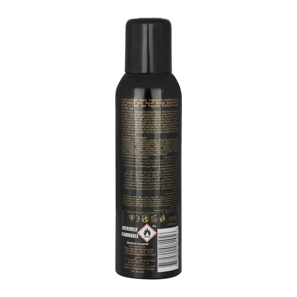 Royal Mirage Deodorant Body Spray Night (200ML) is a long-lasting fragrance spray designed for men, offering a bold and captivating scent. Its rich, woody, and spicy aroma is perfect for evening wear, providing freshness and confidence. The 200ML size ensures lasting use, while the alcohol-based formula keeps you feeling refreshed. Ideal for those who prefer a sophisticated night-time fragrance.