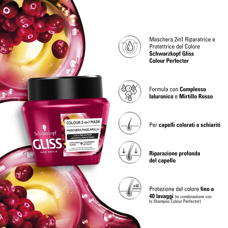 Schwarzkopf Gliss Hair Mask Colour Perfector 2 In 1 300ML is specially formulated to protect and enhance color-treated hair. This versatile treatment can be used as both a rinse-off mask and a leave-in conditioner, offering deep nourishment and vibrant color protection. Enriched with UV filters and keratin, it helps preserve hair color for longer, reduce fading, and strengthen the hair structure. Ideal for weekly use, this mask leaves hair soft, manageable, and radiant. With its rich formula, Schwarzkopf Gliss Hair Mask Colour Perfector is the perfect solution for maintaining salon-fresh color and healthy, lustrous locks.