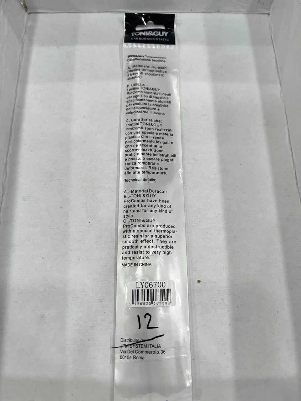 The Toni & Guy Comb Antistatic LY06700 is a professional styling comb designed to reduce static and frizz while detangling and smoothing hair. It features a sleek, ergonomic design with fine teeth for precise styling and is suitable for all hair types. The antistatic properties help minimize flyaways, making it ideal for salon use or everyday grooming.