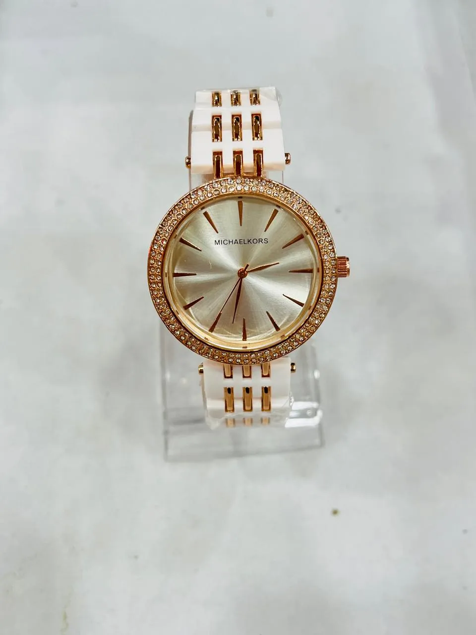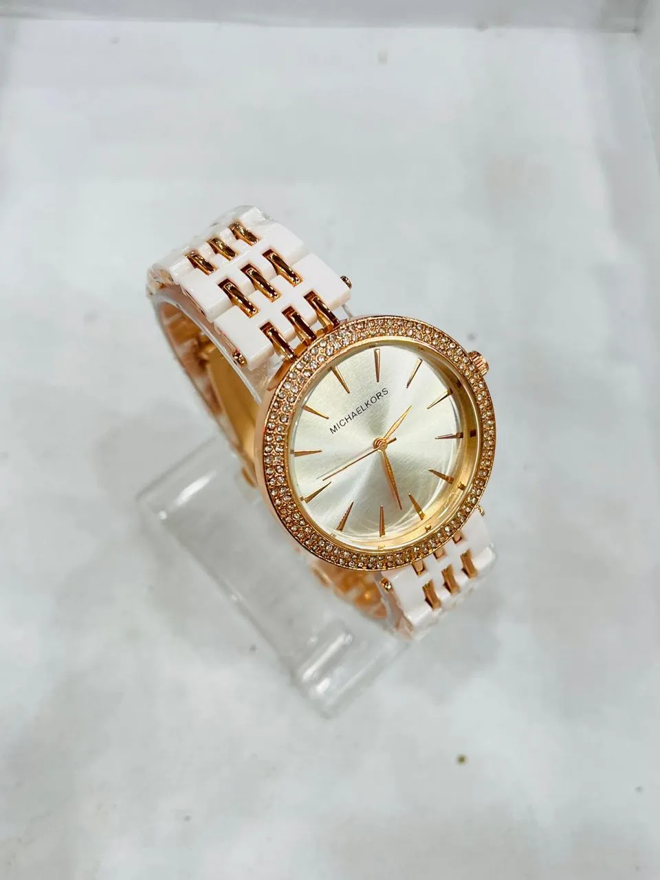 The Michael Kors Stone Chain Unisex Watch in rose gold features a stylish, versatile design with a chain-link bracelet adorned with artificial diamonds. The watch combines luxury and contemporary fashion, making it suitable for both men and women. The rose gold tone adds a touch of elegance, while the sparkling stones enhance its glamorous appeal. Perfect for casual and semi-formal occasions, this timepiece offers a bold yet sophisticated look.