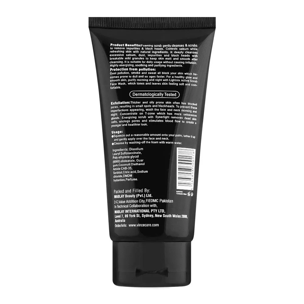 Vince Face Wash Men Scrub Lightnix Active 100ML is a refreshing facial cleanser and scrub designed for men. It deeply cleanses pores, removes dirt and excess oil, and gently exfoliates dead skin cells. Enriched with active ingredients, it helps brighten the skin, control acne, and leave the face feeling fresh and revitalized. Ideal for daily use to maintain smooth, healthy-looking skin.
