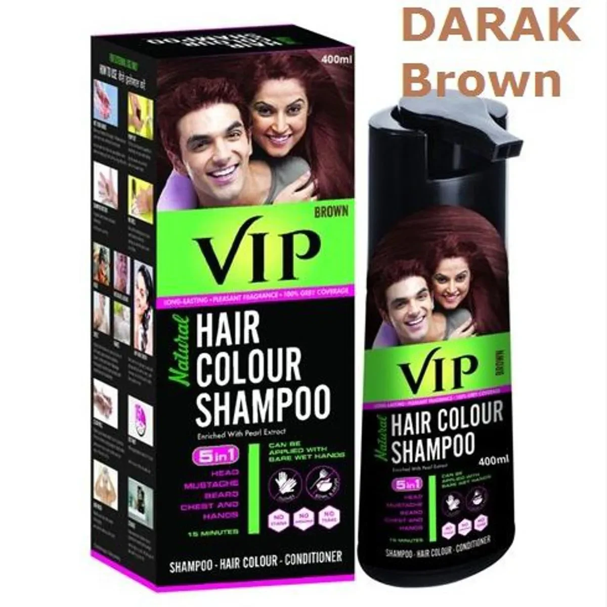 VIP HAIR COLOUR SHAMPOO BROWN 180ML , Brown: VIP Hair Colour Shampoo has revolutionized the way to color your Hair, Moustache, Beard, Chest Hair and Hand Hair. Say Goodbye to traditional black hair dye (or) old fashioned hair color shampoo (or) hair dye shampoo. In One easy DIY hair colour shampoo application, you can get rid of grey hairs in Head, Beard, Moustache, Chest and Hand. This Instant Hair Colour Shampoo is clinically proven and certified that it does not stick on to your hands. This patent pending natural hair colour shampoo is an unisex hair color product that can be used by both Men and Women. Available as Black Colour Naturals Shampoo and Brown Colour Naturals Shampoo, this instant hair color shampoo has truly simplified the way you colour your hair! Since this insta shampoo based hair colour does not stick on your skin and only sticks to the hair, this is preferred over conventional hair dye, hair cream colour, henna hair colour powder and henna hair color shampoo products. VIP will be the top choice for customers looking for both hair colour black and hair colour brown! It’s now very simple to colour your hair without using Gloves, Bowl & Brush. In three Easy Steps, you can get rid of grey hair by using this Ammonia Free Hair Color Shampoo. Step 1: Wash your Hand thoroughly and pour VIP Hair Colour Shampoo on your Palm without any Gloves. Rub till you get rich lather. Step 2: Apply the lather on your Hair and any other Hair that you wish to Colour. The Application process is similar to application of regular hair shampoo. Wash off your hands with-in 3 Minutes. Step 3: Wash & Rinse your hair thoroughly in 15 Minutes. You will get a gorgeous looking hair without any grey hair. This Unisex Shampoo based hair colour is loved by Men since it gives 5 In 1 Coverage. This is a remarkable hair color for Men! Moustache Colour & Beard Colour cannot get any simpler! Even if you don’t wish to colour your hair, this can be used as natural beard color shampoo and natural Moustache color Shampoo! Men love this VIP Hair Color Shampoo as it is a top Speed Colour solution as the application process is lot simpler than natural crème based hair color. VIP has won several consumer choice awards for being a quality hair color for Men shampoo! Women simply love the black shade and brown shade of VIP Natural hair color shampoo as this acts as both hair colour shampoo and hair colour conditioner. The VIP Hair Colour Shampoo is long lasting upto 3 weeks and it provides natural gloss colour and stunning looks that is visible to our eyes. Usually, the routine of Women hair colour application is messy and cumbersome. For the ease of application, Women prefer the VIP Hair Colour Shampoo over any other crème color / gel color hair dye or Shampoo. Women love the secret salon hair colour looks which they get at the comfort of their home. This works as the best hair colour for women also.