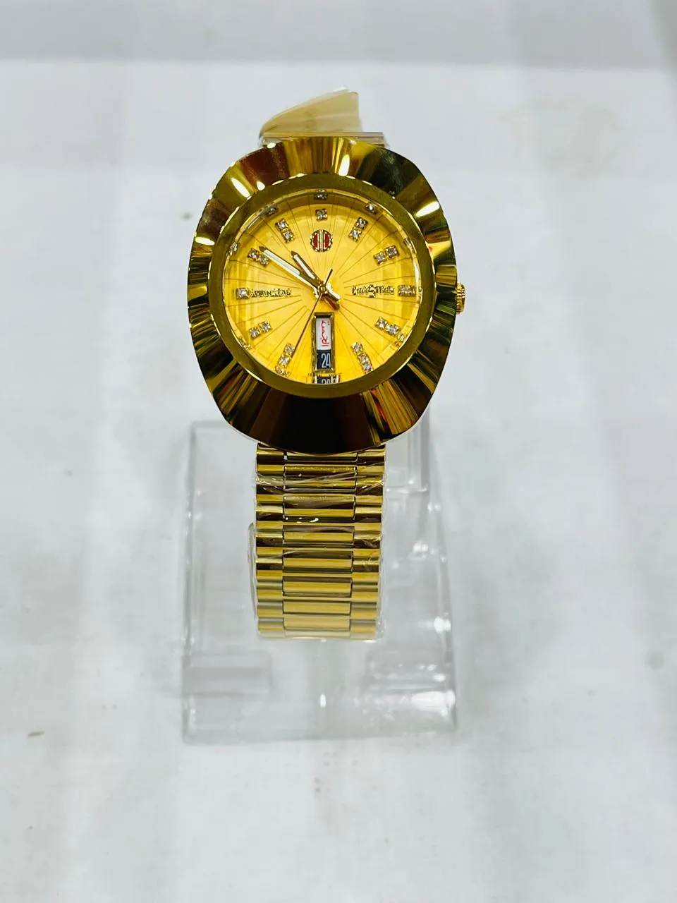 The 3G Golden Chain Golden Dial with Day and Date is a stylish and elegant wristwatch featuring a gold-tone metal bracelet and a shimmering golden dial. It includes day and date display windows, offering both functionality and a luxurious aesthetic. The watch is designed for a sophisticated look, making it suitable for both formal and casual occasions. Its 3G branding adds a modern touch to the classic gold design.