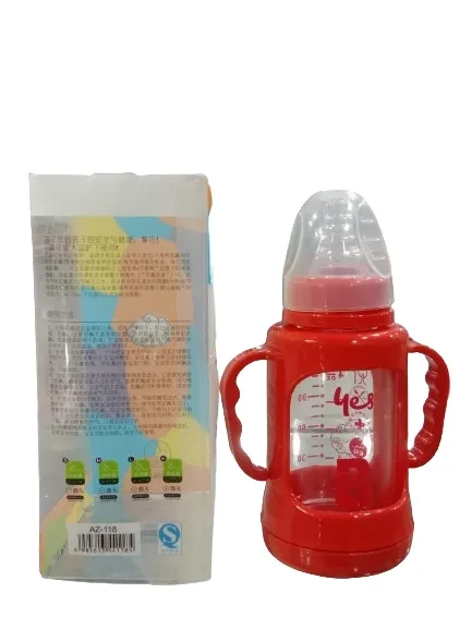 The 4es Feeder Glass with Rabar Handle AZ-118 (120ml) is a durable, heat-resistant feeding bottle designed for infants. It features a soft silicone teat for comfortable feeding, a unique rabar handle for easy gripping, and a 120ml capacity. Made from high-quality, BPA-free glass, it ensures safety and hygiene. The ergonomic design makes it easy for babies to hold, promoting self-feeding. Suitable for sterilization (boiling, steam, or microwave).