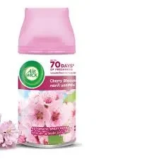 The Air Wick Freshener Auto Machine with Cherry Blossom Refill is an automatic air freshener that sprays bursts of fragrance at regular intervals. The Cherry Blossom scent offers a delicate, floral aroma with sweet and fresh notes.