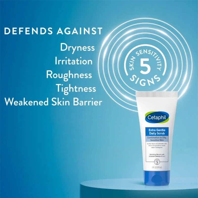 Cetaphil Face Scrub Tube Extra Gentle Daily 178ML is a gentle, non-irritating exfoliating scrub designed for sensitive skin. Its mild formula effectively removes dead skin cells, dirt, and impurities without drying or causing irritation. The scrub contains micro-fine particles that provide a smooth and gentle exfoliation, revealing refreshed, soft, and radiant skin. It is ideal for daily use, helping to improve skin texture and promote a healthy complexion. Dermatologist-tested and suitable for all skin types, including dry and sensitive skin, it helps maintain the skin's natural moisture balance while offering a refreshing cleanse.