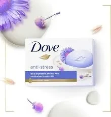 Dove Soap USA Anti Stress Blue Chamomile And Oat Milk 106G Days spent staring at screens can take their toll on your skin – and your wellbeing. Did you know that dry skin is a symptom of stress. Dove Anti-Stress Beauty Bar moisturizes to calm skin while you shower. Infused with a blue chamomile and oat milk scent, the moisturizing bar's kind-to-skin formula is enhanced by a feel-good fragrance that'll lift your spirits. Dove Anti-Stress Beauty Bar cleanser has a mild formula that's paraben-free and contains no sulfate cleansers. This body bar – with ¼ moisturizing cream