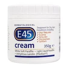 The E45 Cream Jar 350g is a rich, emollient moisturizer designed to soothe and hydrate dry, sensitive, or irritated skin. It contains light liquid paraffin, white soft paraffin, and lanolin to help restore the skin's moisture barrier.