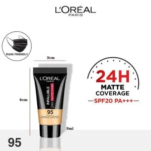 The L'Oréal Infallible Pro-Glow Foundation (shade 95) is a lightweight, liquid foundation known for its radiant, dewy finish. It provides medium coverage with a long-lasting formula (up to 24 hours) and contains SPF 15. Ideal for normal to dry skin, it gives a natural glow while being blendable and hydrating. The tube packaging makes it travel-friendly.