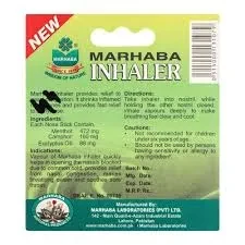 Marhaba Inhaler Nose Care is a herbal nasal inhaler designed to provide relief from nasal congestion, colds, and sinus discomfort. It typically contains natural ingredients like menthol, eucalyptus oil, and camphor to help clear blocked nostrils, ease breathing, and refresh the senses. Portable and easy to use, it offers quick relief for stuffy noses and headaches associated with sinus issues. Always check the ingredients for allergies before use.