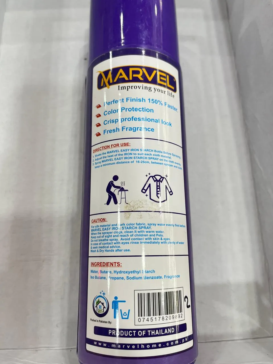 Marvel Easy Iron Spray Double Starch 620g is a convenient starch spray designed to make ironing easier. It provides a double-strength formula for crisp, long-lasting creases and smooth fabrics. The spray application ensures even distribution, reducing wrinkles and saving time during ironing. Suitable for most fabrics, it helps maintain a polished look on clothes with minimal effort.