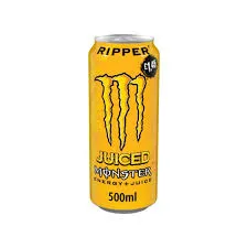 Monster Energy Juiced 500ml is a fruity, juice-infused energy drink combining Monster's signature energy blend with real fruit juice. It comes in flavors like Khaotic (orange, tangerine, peach) and Pipeline Punch (passionfruit, guava, orange). Contains caffeine, B-vitamins, and taurine for a boost. Sold in a bold, colorful 500ml can.