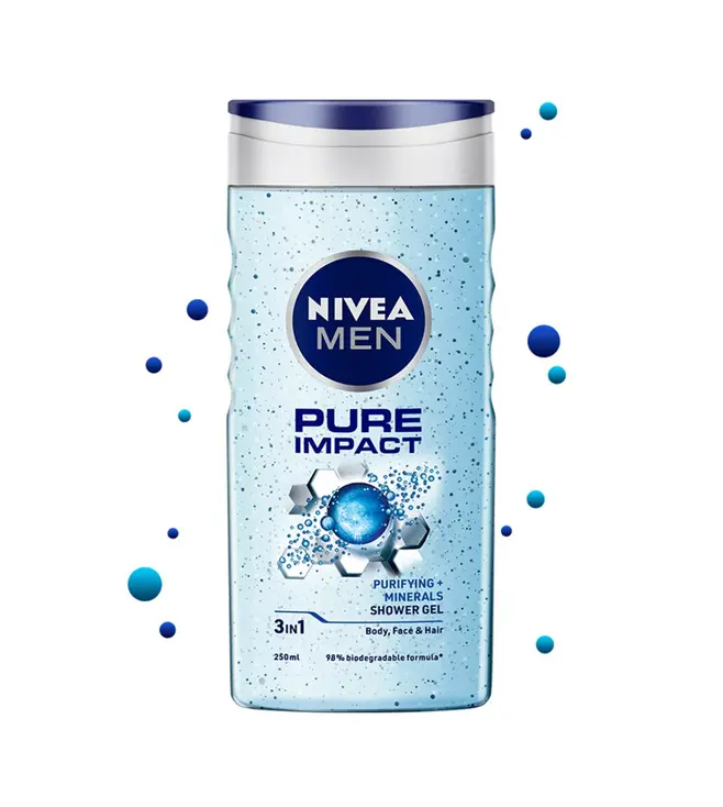 NIVEA Men Body Wash 3in1 Pure Impact 500ml is a versatile grooming product designed for men. It functions as a shower gel, shampoo, and face wash in one, offering a deep-cleansing and refreshing experience. Enriched with magnesium and sea minerals, it helps remove impurities, oil, and sweat while providing a cooling, invigorating sensation. The 500ml bottle is convenient for daily use, and the masculine, sporty fragrance leaves skin feeling clean and revitalized. Ideal for active men seeking an efficient, all-in-one shower solution.