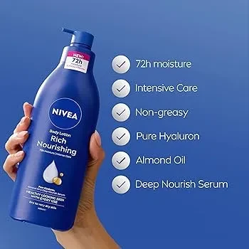 Transform dry skin into soft and supple skin with Nivea Lotion Rich Nourishing. This deep moisture lotion is enriched with Nivea's Deep Moisture Serum and almond oil, providing intense hydration that lasts up to 48 hours. Designed for very dry skin, it absorbs quickly, leaving no greasy residue while giving your skin a healthy glow.