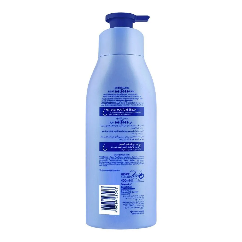 Nivea Lotion Shea Smooth (400ml) is a rich, nourishing body lotion infused with shea butter and deep moisture serum. It provides 48-hour hydration, leaving skin feeling soft, smooth, and supple. The lightweight formula absorbs quickly without greasiness, ideal for dry to very dry skin. Its pleasant, subtle fragrance enhances the moisturizing experience. Suitable for daily use.