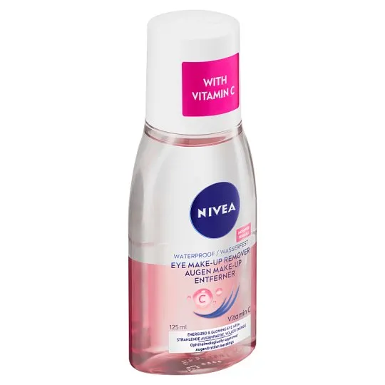 The Nivea Make-Up Remover Eye Vitamin C (125ml) is a gentle, dual-phase formula designed to effectively remove waterproof eye makeup while nourishing the delicate eye area. Enriched with Vitamin C, it helps brighten and refresh the skin. The solution is oil-free, suitable for sensitive eyes, and leaves no greasy residue. Simply shake to activate the two-phase formula, apply with a cotton pad, and wipe away makeup effortlessly.
