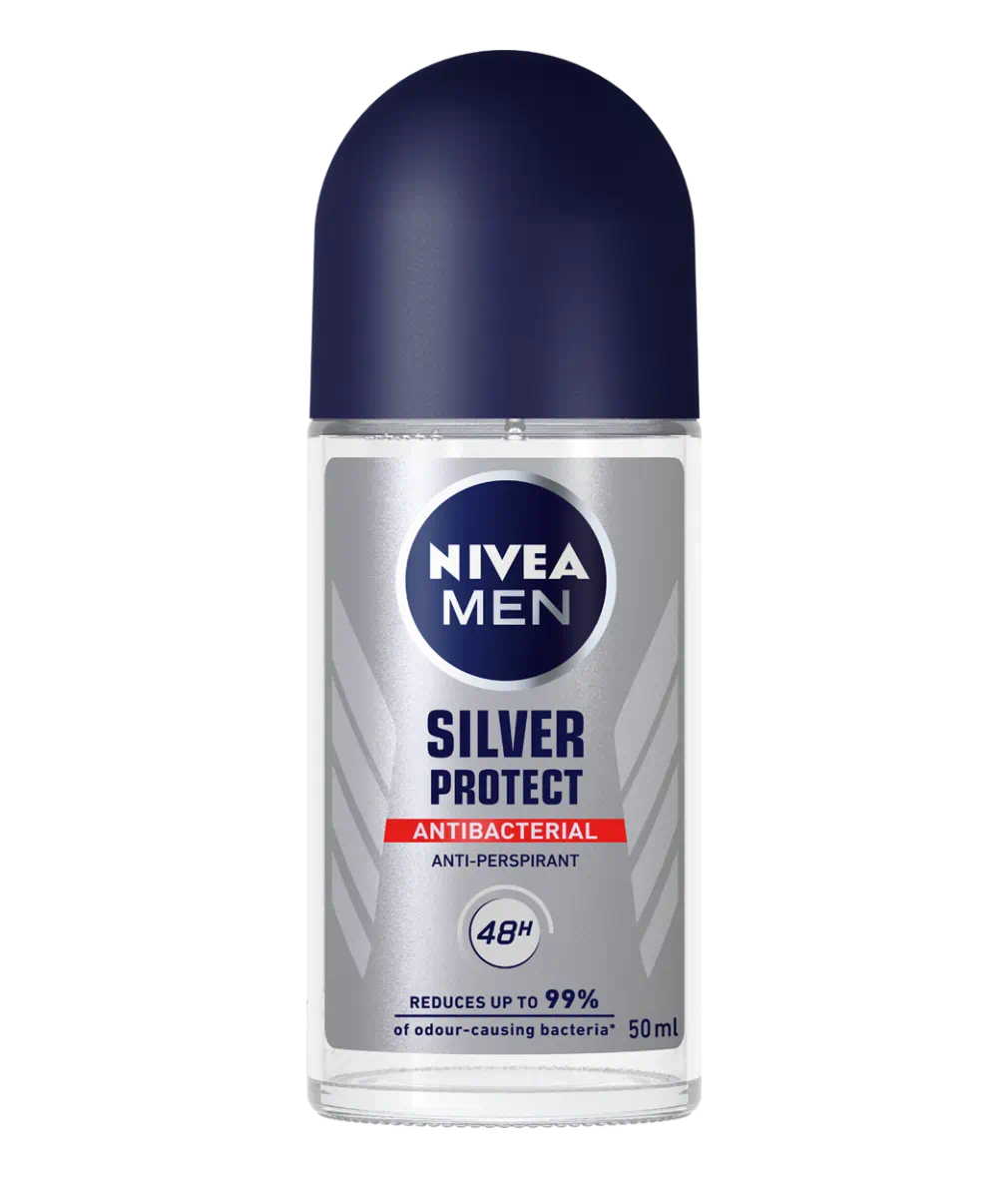 The Nivea Deodorant Roll-On Men Silver Protect Anti-Bacteria (50ml) is a long-lasting deodorant designed for men, offering 48-hour protection against sweat and odor.