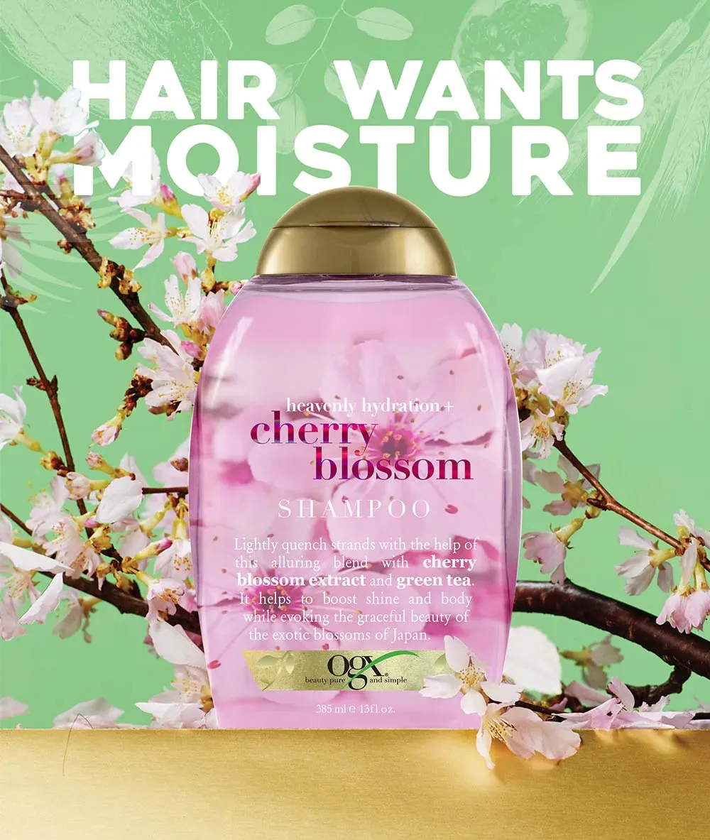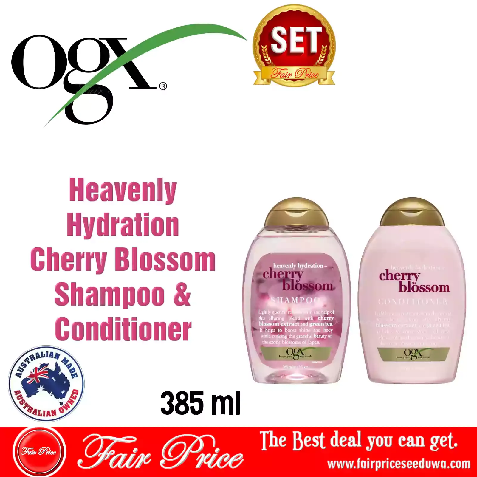 The OGX Conditioner Cherry Blossom 385ml is a hydrating and lightweight conditioner designed to nourish and soften hair. Infused with cherry blossom extract, silk proteins, and sweet almond oil, it helps to add shine, improve manageability, and protect hair from damage. The formula is sulfate-free, paraben-free, and gently scented with a delicate floral fragrance. Ideal for all hair types, it leaves hair feeling smooth, refreshed, and lightly perfumed. The 385ml bottle comes in OGX's signature stylish packaging.
