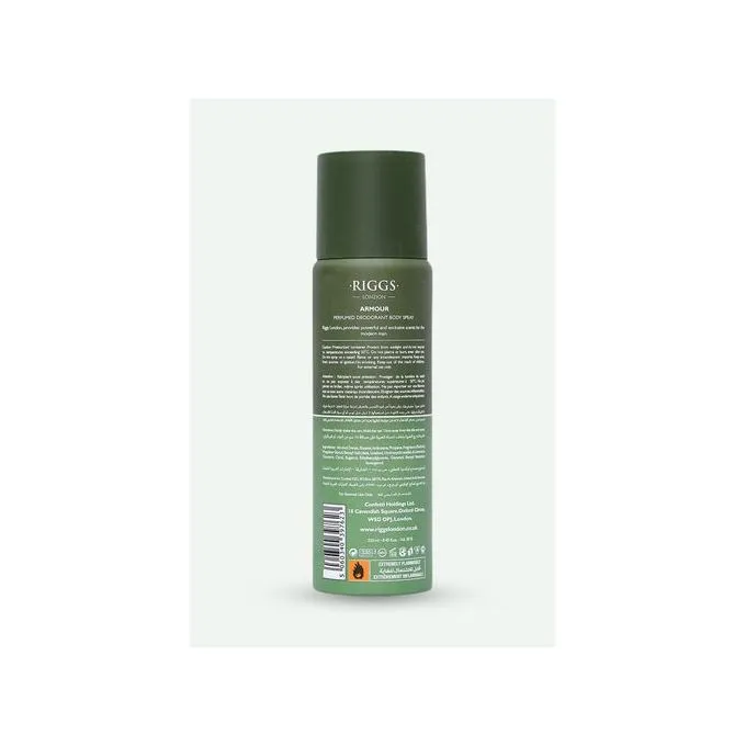 Riggs London Deodorant Body Spray Armour (100ml) is a bold, masculine fragrance designed for men. It features a powerful, long-lasting scent with woody, spicy, and aromatic notes, offering freshness and confidence throughout the day. The compact spray bottle makes it easy to carry and apply, providing effective odor protection with a rugged, modern appeal. Ideal for daily wear or active lifestyles.
