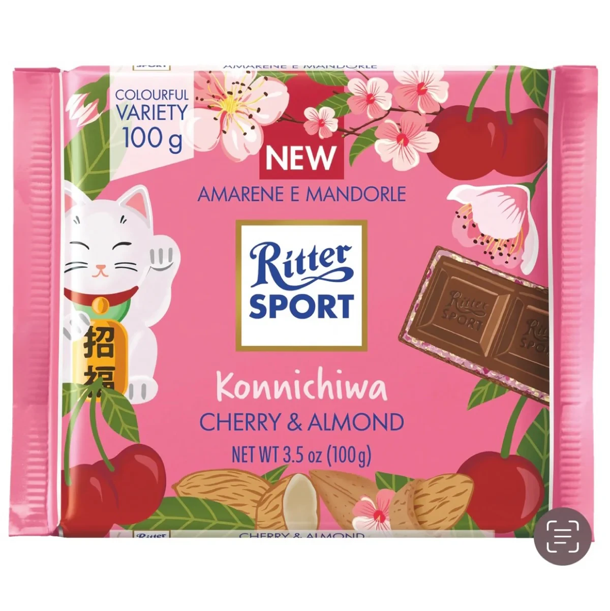 The Ritter Sport Cashew chocolate bar (100g) features smooth milk chocolate filled with crunchy, roasted cashew nuts. It offers a perfect balance of creamy sweetness and nutty richness, making it a delicious and satisfying snack. The bar is divided into square portions, typical of Ritter Sport's iconic square shape. Ideal for nut lovers!