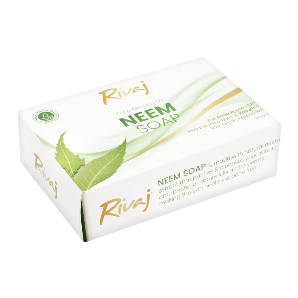 Rivaj Face Soap Neem 100g is a herbal soap enriched with neem extract, known for its antibacterial and anti-inflammatory properties. It helps cleanse the skin, control excess oil, and prevent acne and blemishes. Suitable for oily and acne-prone skin, it promotes a clearer and healthier complexion. The soap is free from harmful chemicals and gently exfoliates while maintaining skin's natural moisture.