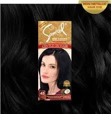 Samson Hair Colour Black 45 is a permanent hair dye that provides deep, long-lasting black color with a natural finish. It is formulated with conditioning agents to help nourish hair while covering grays effectively. Suitable for all hair types, it ensures even coverage and vibrant results. The product is easy to use, typically requiring mixing with a developer before application.
