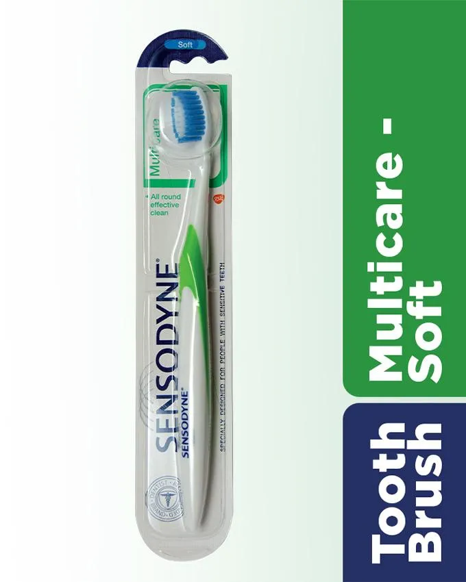 The Sensodyne Toothbrush Multicare Soft PK is a soft-bristled toothbrush designed for sensitive teeth and gums. It features gentle bristles to protect enamel and reduce gum irritation, while effectively cleaning teeth. The ergonomic handle ensures a comfortable grip, and its compact head allows for better reach in tight spaces. Ideal for daily use, it helps maintain oral hygiene without causing discomfort. (Pack details may vary.)