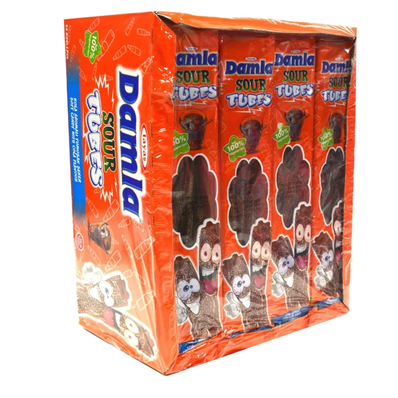 Tayas Damla Sour Tube Assorted Cola Flavour is a chewy, sour candy in a tube format, offering a tangy and fizzy cola taste. The assorted colors add a fun element, making it a popular choice for those who enjoy sweet-and-sour treats. The texture is typically soft and slightly sticky, with a bold, refreshing cola flavor. Perfect for candy lovers who enjoy intense, fruity-sour experiences.