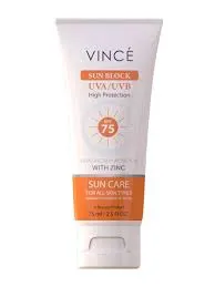 Vince Sunblock SPF 75 (80ml) – A lightweight, high-protection sunscreen offering broad-spectrum UVA/UVB defense with SPF 75. Water-resistant and fast-absorbing, it’s designed for daily use to prevent sunburn and premature aging. Ideal for all skin types, including sensitive skin, with a non-greasy, moisturizing formula. Free from parabens and harsh chemicals.